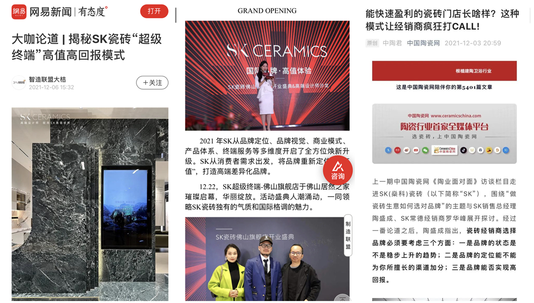 SK瓷磚,與眾多權(quán)威大眾媒體、行業(yè)媒體進行長期戰(zhàn)略合作,用更大范圍的曝光輻射人群,并用優(yōu)質(zhì)的內(nèi)容精準圈粉,通過多維度品牌傳播等,更好地推進品牌建設(shè)與升維。